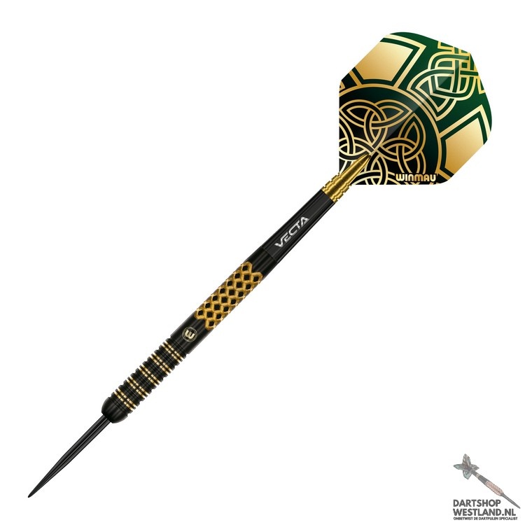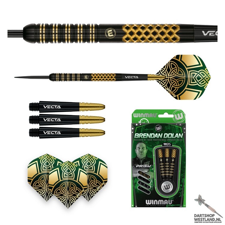 Het geheel wordt afgewerkt met een Black Onyx coating, gouden details, Short Black & Gold Vecta shafts en groen/goud foiled flights – een uitstraling die net zo iconisch is als Brendan Dolan zelf.