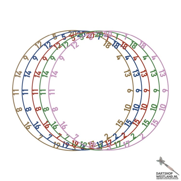Geef je dartbord een unieke look met de Bull’s Colorful Matt Number Ring in het Goud, blauw, roze, rood of groen. De vijf mat gekleurde ringen (rood, groen, roze, oranje, goud) passen op elk standaard dartbord.
