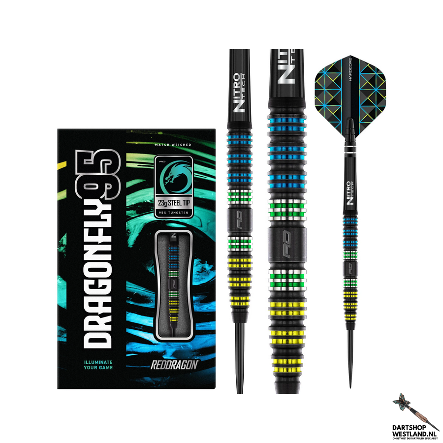 Dragonfly 95 Black - Tapered 95% - Dartpijlen . Neem de vlucht met de Dragonfly95 - Een nieuwe generatie unieke en opwindende details, gebaseerd op een klassieker van 95% wolfraam. Verlicht je game met een all-out onyxcoating in combinatie met een reeks kleurrijke accenten die geen concessies doen aan de prestaties. Ontgrendel precisie door optimale balans en lever een traject dat bij uw stijl past.