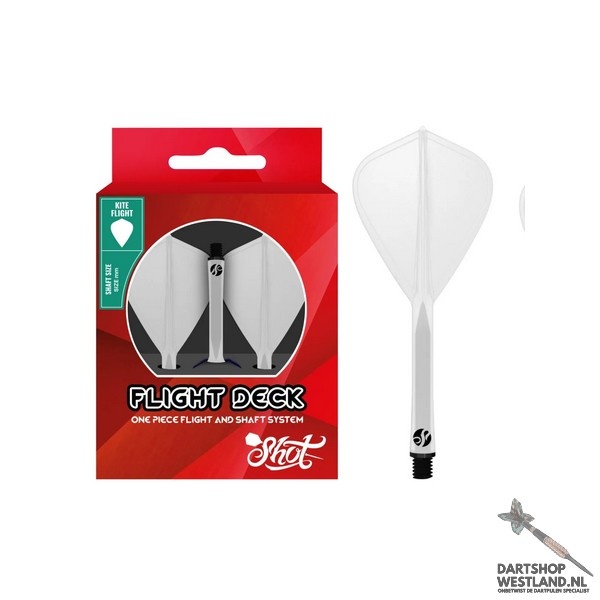De Shot Flight Deck One Piece Clear Short Kite flights zijn transparant en stijlvol. Hun compacte kitevorm zorgt voor snelheid en een strakke vlucht. Ideaal voor precisieworpen. Verkrijgbaar bij DartshopWestland.