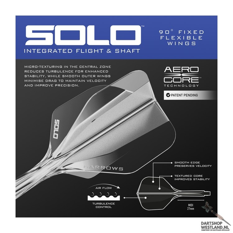Daarnaast zijn de darts voorzien van de nieuwe Midi Solo integrated flights met Aero Core-technologie. De microtextuur in het midden van de flight vermindert turbulentie en verbetert de stabiliteit, terwijl de gladde buitenvleugels de luchtweerstand minimaliseren voor maximale snelheid en precisie.