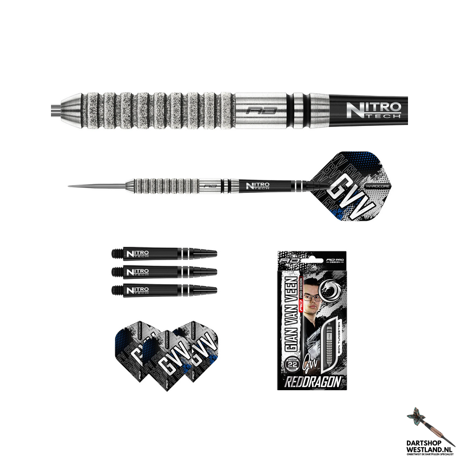 Gian van Veen Tour Edition 90% - Dartpijlen . De GVV Tour Edition-reeks is gestileerd om de snelle opkomst van een van de meest opwindende jonge spelers van de sport te weerspiegelen. Parallel geformatteerd 90% wolfraam met dynamische bewerking en geoptimaliseerde grip, zorgt voor een snelle respons en ultieme werpstabiliteit voor opwindende en moeiteloze prestaties.