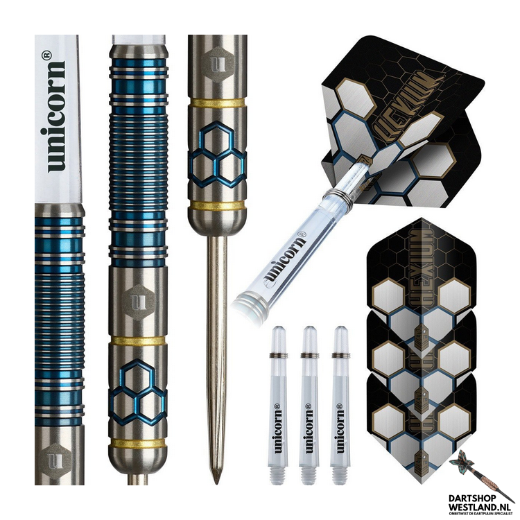 Gemaakt van 90% tungsten van professionele kwaliteit, levert de Hexium 2 Blue niet alleen stijl, maar ook de betrouwbaarheid die je van Unicorn mag verwachten. Stap met vertrouwen aan de oche en ervaar de perfecte mix van techniek en uitstraling.