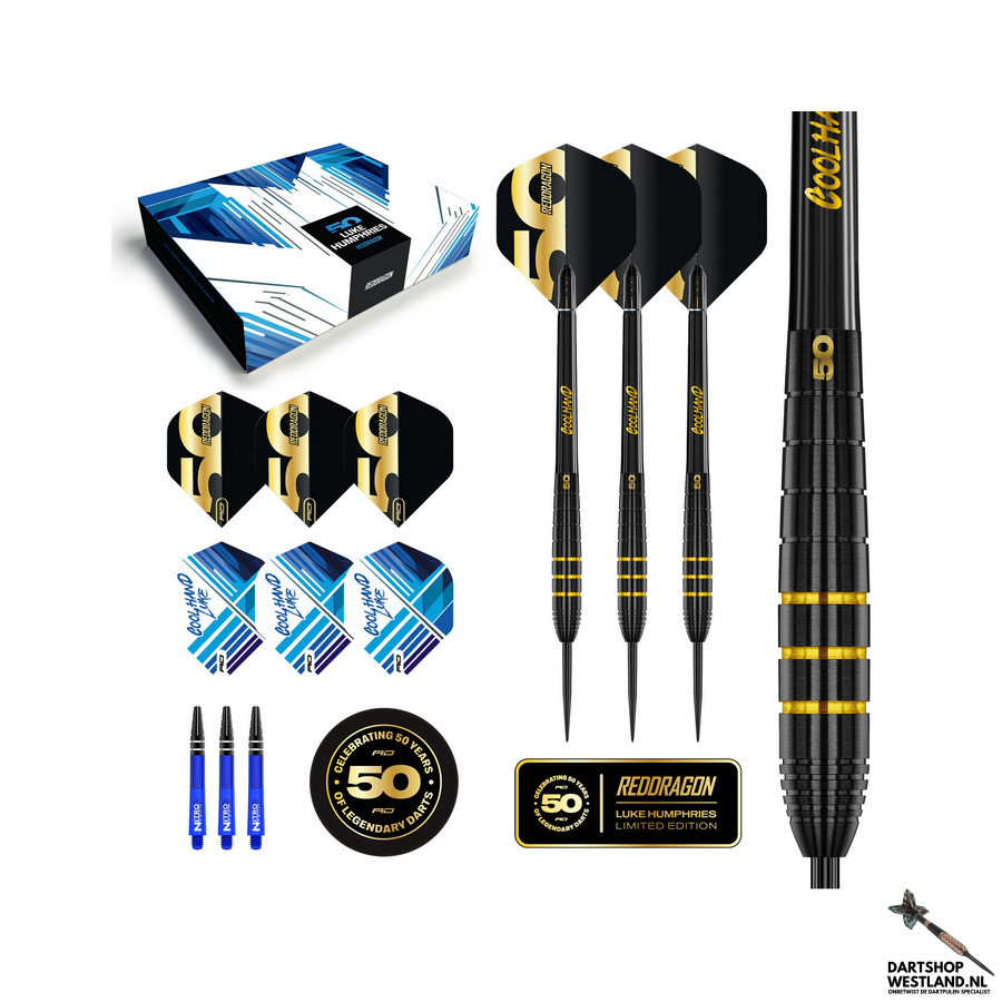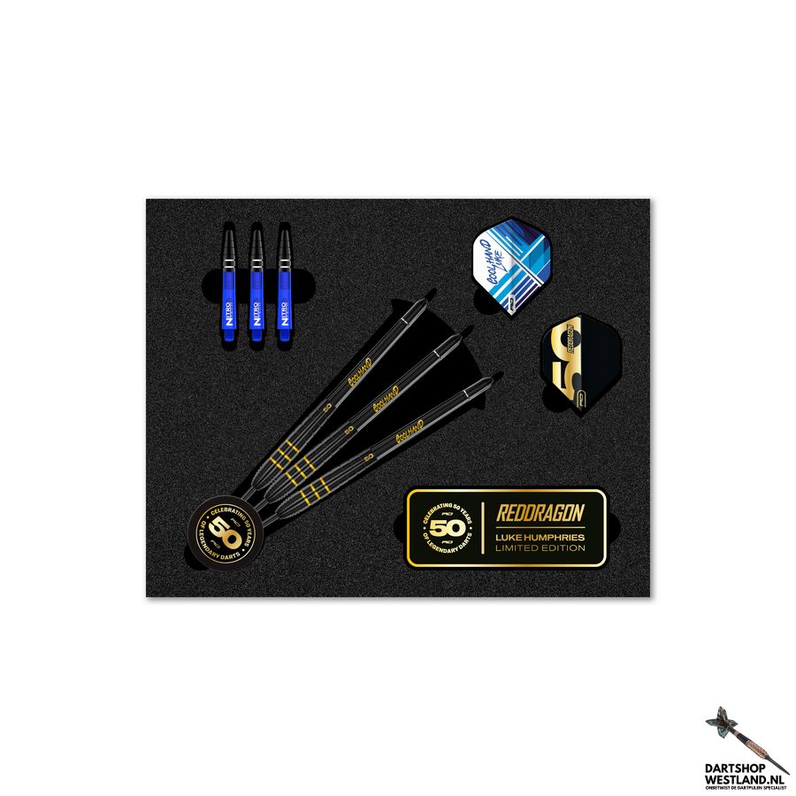 Deze dartpijl is beschikbaar in 22 Gram. Luke Humphries – 50 jaar Limited Edition Dart Luke Humphries heeft zijn naam met meedogenloze precisie in moderne darts geëtst. Nu zijn de darts die hij gebruikte om de geschiedenis te definiëren als wereldkampioen, Triple Crown-kampioen en nummer 1 van de wereld, vereeuwigd in deze verbluffende 50-jarige Limited Edition. Het is een eerbetoon aan zijn opkomst, geleverd in een mix van zwarte onyx en 24-karaats schittering. Deze 90% wolfraamdarts zijn gemaakt met de vertrouwde torpedoloop van Cool Hand, de subtiele radiale grip en de kenmerkende gewogen balans aan de voorkant, en leveren de soepele release en zelfverzekerde controle die ten grondslag liggen aan zijn klinische stijl. Elke set is verpakt in een high-end displaydoos voor verzamelaars en bevat een kenmerkende plaquette, op maat gemaakte 50-jarige stelen en flights, Nitrotech-back-ups en exclusieve spelersflights. Laat ze met trots zien, of speel om te winnen met deze prachtige limited edition darts. Gebouwd voor kampioenen. Gemaakt voor nalatenschap. .