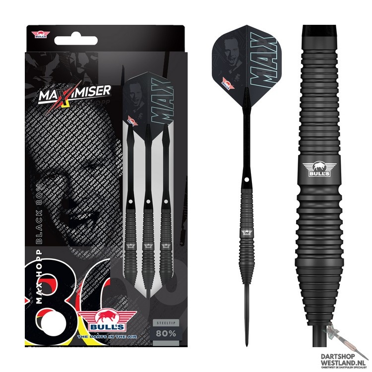 De Bull’s Max Hopp 80% Black darts zijn geïnspireerd door de Duitse prof Max Hopp. Met een torpedovorm en klassieke ring grip biedt deze dart betrouwbaarheid en stijl. De strakke zwarte afwerking en exclusieve Max Hopp flights maken de set compleet.