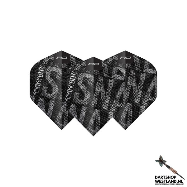 De Peter Wright Black Mamba Premium Standard dartflights zijn ontworpen in samenwerking met Snakebite zelf. Het iconische Black Mamba-design met slangenprint sluit perfect aan bij de darts van Peter Wright en zorgt voor een professionele uitstraling op de oche. De Premium Standard vorm biedt uitstekende lift, stabiliteit en een consistente vlucht, ideaal voor spelers die controle en betrouwbaarheid zoeken. Geleverd per set van 3 flights. Upgrade je setup en speel met het vertrouwen van een wereldtopper – nu verkrijgbaar bij Dartshopwestland.