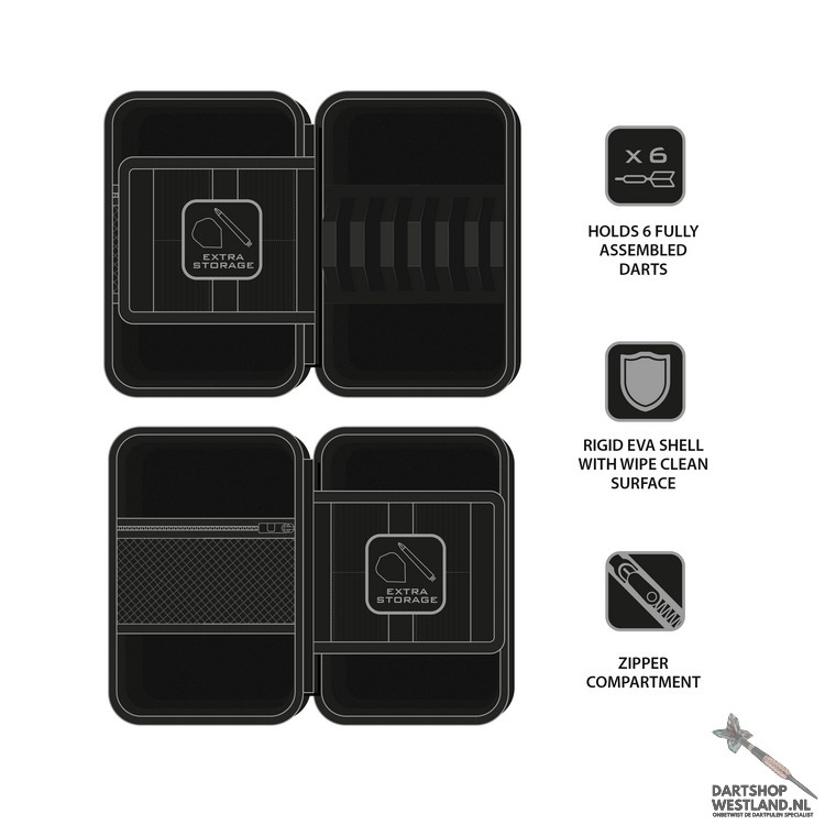 Gemaakt van stevig EVA-materiaal, biedt deze case uitstekende bescherming tegen stoten en slijtage. Binnenin is ruimte voor twee volledig gemonteerde dartsets, plus extra opbergruimte voor flights, shafts en accessoires.