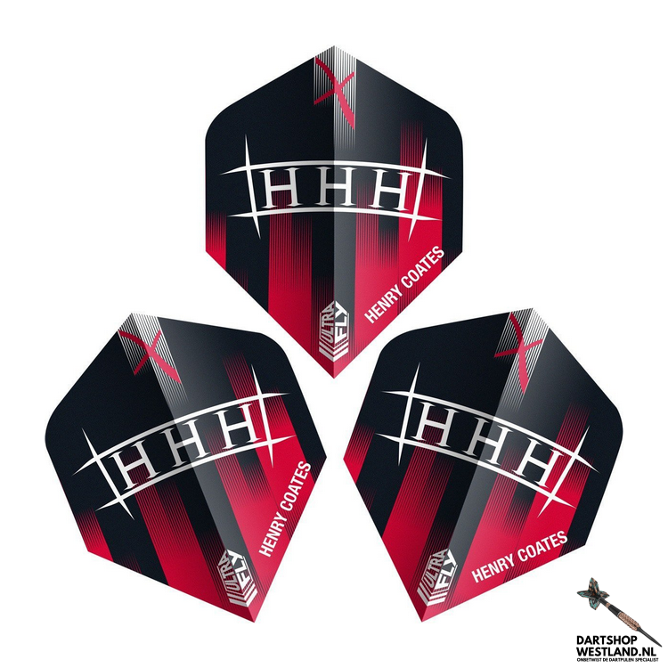 Het gedurfde rood-zwart-witte kleurenschema met het opvallende “HHH”-logo weerspiegelt de krachtige en zelfverzekerde speelstijl van Coates. Dankzij het Ultrafly.100-materiaal zijn deze flights ultradun, licht en duurzaam, terwijl de No.2 (standaard) vorm zorgt voor maximale stabiliteit en controle.
