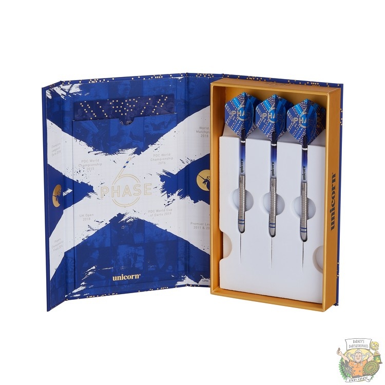 Alweer Phase 6 van de Unicorn Gary Anderson darts. Deze darts worden geleverd in een zeer sjieke doos met gouden accenten. W.C. Gary Anderson Phase 6 90% Tungsten darts zijn de nieuwste Gary Anderson darts. Op de barrel vind je een combinatie van een shark en ringed grip. De barrels zijn recht en worden geleverd inclsueif shafts en flights.
