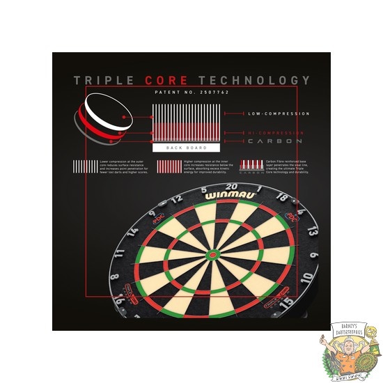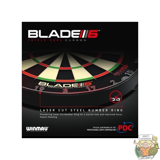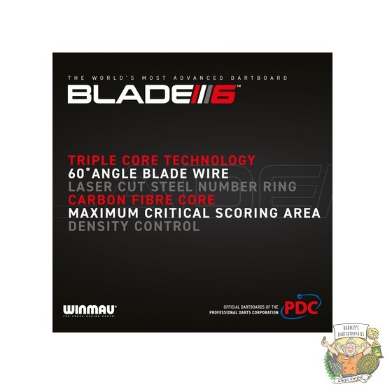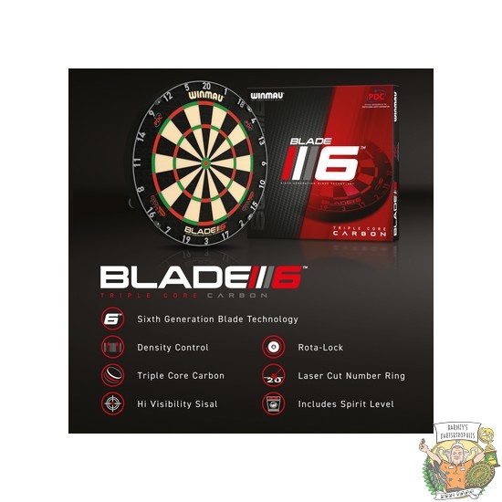 De winmau Blade 6 Triple Core - Het Winmau Blade 6 TC dartbord is het technisch meest geavanceerde dartbord van Winmau. De Winmau Blade 6 Triple core is ontwikkeld na 30 jaar innovatie en ontwikkeling door Winmau. De vervanger van de Blade 5 dartborden zijn weer beter dan zijn voorgangers. Zo is het revolutionaire Triple Core sisal van uitstekende kwaliteit en zorgt voor een maximale levensduur en minder belasting van de sisal lagen. De Triple core dartborden van Winmau zijn ruim op voorraad bij Barney's darts in Den Haag. Bestel je Triple core dartbord online. De Blade 6 Triple core is voorzien van een nieuwe cijferring welke geproduceerd is via een anti glans laser techniek voor het ultieme spel plezier. De Blade 6 Triple core is voorzien van de laatste‘Density Control™’ techniek wat ervoor zorgt dat het Triple core dartbord ook meer ruimte biedt voor een nog smallere webring. De ring is gesneden in een hoek van 60 graden waardoor je nog minder bouncers hebt.